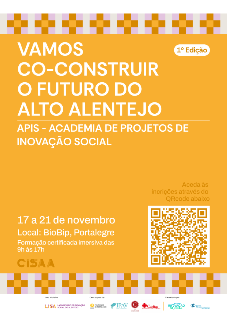No âmbito do projeto Centro de Inovação Social do Alto Alentejo (CISAA), do qual a Comunidade Intermunicipal do Alto Alentejo é parceira, divulgamos que está aberto o período de inscrições para a Academia de Projetos de Inovação Social (APIS), uma iniciativa que convida pessoas e organizações a co-construir o futuro do distrito de Portalegre, através da inovação social, do empreendedorismo de impacto e da colaboração.